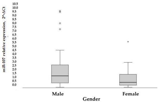 Rectangular chart of patient’s MiR-107 expression, according to gender, p = 0.006 according to nonparametric Whitney-Mann test. o and *—displays the distribution of data based on a five number summary (“minimum”, first quartile (Q1), median, third quartile (Q3), and “maximum”).