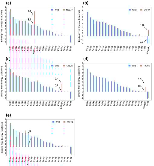Residue-specific binding free energy data of the S protein between the wild type and the different mutants in binding to ACE2 from the ASGB calculation. (Calculated results were averaged over 5 trajectories separately). The (a–e) show the specific binding affinity contributions of interface residues on S protein for wild type and N501Y, E484K, L452R, T478K and K417N complex.