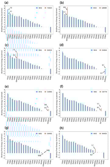 Residue-specific binding free energy data of the S protein between the wild type and the different mutants in binding to ACE2 from the ASGB calculation. (Calculated results were averaged over 5 trajectories separately). (a–h) show the specific binding affinity contributions of interface residues on S protein for wild type and Y505H, Q498R, Q493K, E484A, G496S, S477N, G446S and N440K complex.