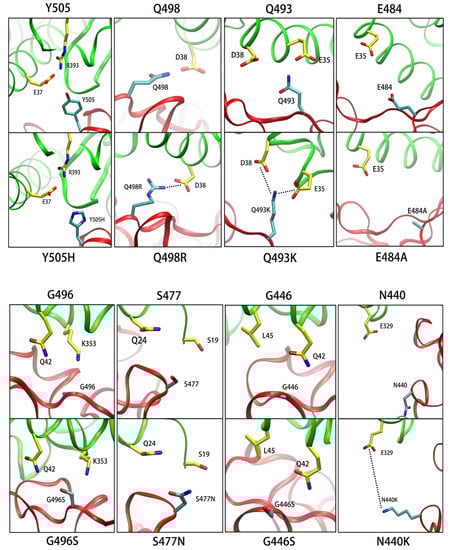 The local interaction structures of the wild type (above figures) and mutants (below figures) in SARS-CoV-2 S-protein/ACE2 complexes. The wild-type Y505 and mutated Y505H. The wild-type Q498 and mutated Q498R. The wild-type Q493 and mutated Q493K. The wild-type E484 and mutated E484A. The wild-type G496 and mutated G496S. The wild-type S477 and mutated S477N. The wild-type G446 and mutated G446S. The wild-type N440 and mutated N440K.