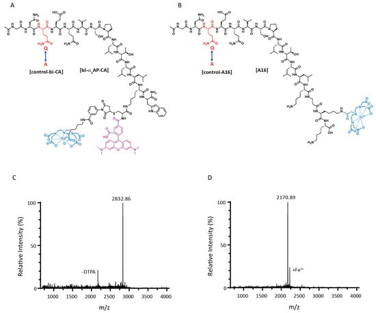 Schematic representations of the previously developed bi-2-AP-CA (A, modified from []), and the optimized probe A16 (B), which is conjugated to the chelator DTPA (blue), enabling labelling with In. Substitution of glutamine to alanine (Q3→A3) leads to a control probe (control-bi-CA or control-A16, respectively), which does not bind to fibrin (C,D). Mass spectra of bi-2-AP-CA and A16, respectively, showing a mass of 2832.86 and 2170.89 (calculated masses: 2832.92 and 2170.15).