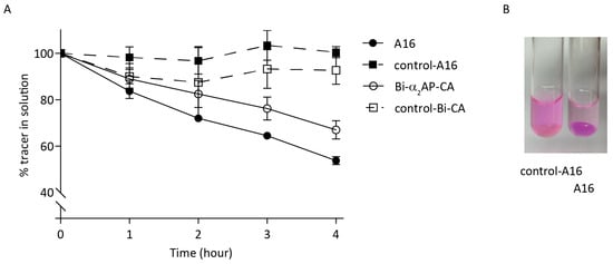 The bimodal peptides bi-2-AP-CA and control-bi-CA were synthesized using tert-butyloxycarbonyl solid-phase peptide synthesis [] as described by Miserus et al. []. A16 and control-A16 were synthesized and conjugated with either DTPA or Lissamine rhodamine-B (LisB) by Fmoc-based solid-phase peptide synthesis using standard protocols []. In-A16 and In-control-A16 were prepared by adding 50–60 MBq InCl (Mallinckrodt, Petten B.V., The Netherlands) to 10 g of DPTA-conjugated A16 (4.6 nmol) or control-A16 (4.7 nmol), dissolved in 200–300 L of 0.1 M 2-(N-morpholino)ethane sulfonic acid (MES) buffer of pH 5.5. Radiolabelling was performed for 20 min at room temperature. Radiochemical purity was determined by RP-HPLC (LC-20AT, Shimadzu Benelux, ‘s-Hertogenbosch, The Netherlands) using a C18 column (RP-C18 Inertsil ODS-3, 4.6 × 250 mm, 5 M, Phenomenex, Utrecht, The Netherlands) eluted with a linear gradient of CHCN (0–100% in 30 min) in HO containing 0.1% trifluoroacetic acid (TFA; v/v) at a flow rate of 1 mL/min. The radioactivity was monitored using an in-line radio detector (Gabi, Raytest GmbH, Straubenhardt, Germany). The radiochemical purity of the preparations used in in vitro and in vivo experiments always exceeded 95%. Radiotracers were used without further purification. The In was preferred over other radionuclides (e.g., Tc) because the complex of In and DTPA is more stable in plasma [].