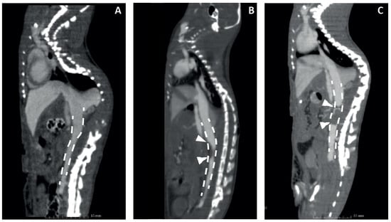 To test the new probe in vivo, two different DVT C57BL/6 mouse models were used. The rapid IVC FeCl model was compared to the IVC stenosis model because the cellular composition and fibrin content are different in the resulting thrombi [,]. Prior to testing the tracer, the models were validated at different time points using CBCT scanning with a single i.v. bolus injection of the contrast agent ExiTron Nano 12000. Representative images are shown in Figure 4, showing an intact V. cava in the mouse receiving sham surgery (A), a lack of contrast on the apical side of the V. cava in the mouse that received FeCl treatment, indicating thrombus formation (B), and a clear negative contrast throughout the V. cava and the location of ligation, indicating an occlusive thrombus in the IVC stenosis model (C).
