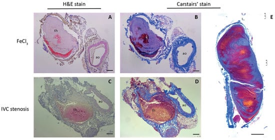 Representative images of transversal slices (A–D) or sagittal slices (E) through thrombi (th) and aorta (ao) induced by FeCl (A,B) or IVC ligation (C–E). Slices were stained with H&E (A,C) or Carstairs’ method for fibrin and platelets (B,D,E), which stains fibrin (bright red), platelets (grey-blue), collagen (bright blue) and red blood cells (yellow). Scale bar = 100 M.