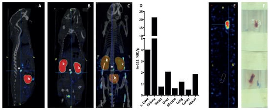As the imaging probe is based on 2-AP and will bind covalently to fibrin, we hypothesized that the tracer uptake would be higher in the IVC stenosis model since the thrombi contain more fibrin than in the FeCl model. In addition, a previous study demonstrated that stasis-induced thrombi were rich in 2-AP in mice and that 2-AP was a strong determinant of thrombus size, indicating an important role of the fibrinolytic pathway in mouse thrombosis []. As proof of concept, we imaged uptake of In-A16 in a C57BL/6 mouse six hours after IVC ligation and in sham-operated mice. Therefore, mice were injected with 13.2 ± 0.4 MBq tracer (200 g/kg body weight) and immediately scanned using SPECT/CT. Figure 6A–D shows representative sections of sagittal (A) and coronal (B) views and a 3D model (C) of a mouse. High uptake was visible in the kidneys and bladder, indicating predominant renal clearance of the tracer. A small droplet of urine is seen at the base of the tail. Asterisks (*) indicate the location of the IVC ligation, where a hyperintense signal indicates uptake of the tracer at the location of the thrombus. Biodistribution studies of the tracer showed high uptake in V. cava and kidneys, indicating uptake of the tracer in the thrombus and renal clearance (Figure 6E). Ex vivo SPECT scans of paraffin-embedded IVCs clearly showed high In-A16 uptake in the IVC of a mouse that received ligation (Figure 6E, top) compared to a mouse that received sham surgery (bottom), indicating that a thrombus is present in the IVC for tracer uptake. Figure 6F shows pictures of the embedded thrombi used for ex vivo scanning. However, in most of our experiments, including mice treated with FeCl, whole-body SPECT did not show uptake of the tracer in vivo, but ex vivo scans of the IVCs with thrombi did reveal uptake of the tracer (Supplementary Figure S4, see Supporting Information).