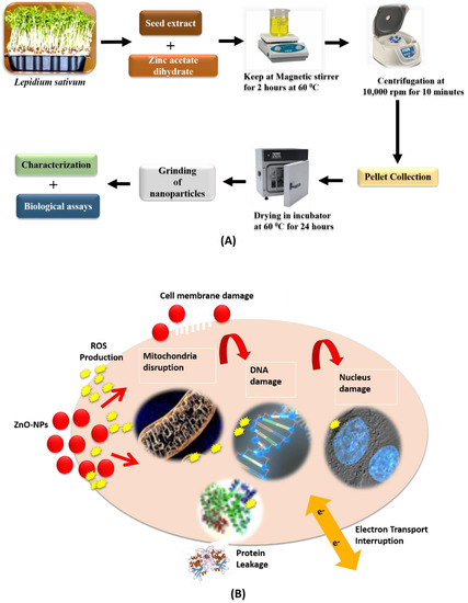 (A) Schematic illustration of bio-assisted synthesis of ZnO NPs via green route using Lepidium sativum seed extract; (B) proposed antibacterial mechanism of action of ZnO NPs. ZnO NPs interact with cell membrane and result in disruption of membrane integrity, thus leading to ion-channel leakage that causes imbalance within the cell. ROS production causes an oxidative stress state in the cell, responsible for protein denaturation, cell-cycle arrest, cellular toxicity, and disruption of mitochondrial function, so the metabolic activities become impaired and finally cell death occurs.
