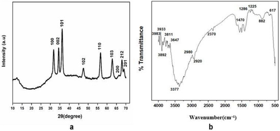 (a) XRD of Lepidium sativum-mediated synthesis of ZnO NPs; (b) FTIR spectra of Lepidium sativum-mediated synthesized ZnO NPs.