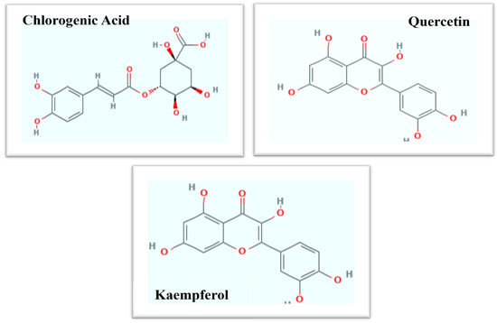 Chemical structure of chlorogenic acid, quercetin, and kaempferol.