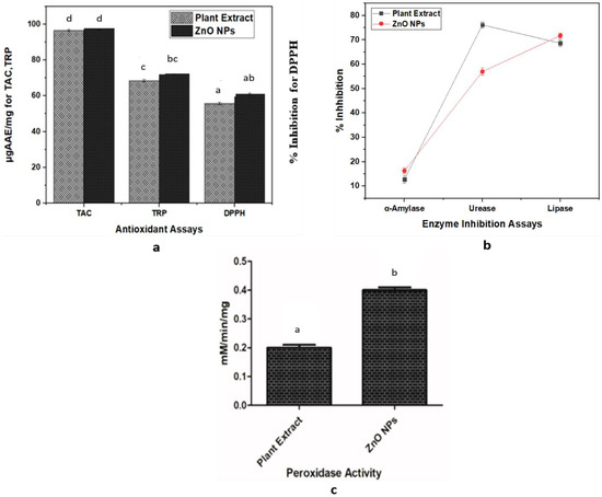 (a) Antioxidant assays performed using plant extract and ZnO NPs; (b) enzyme-inhibition potential; (c) catalytic potential of plant extract and ZnO NPs. Experiments performed in triplicates and values shown as means ± standard deviation. Similar alphabets depicted significant similarity, while differences were shown by different alphabets in the experimental setup (p < 0.05).