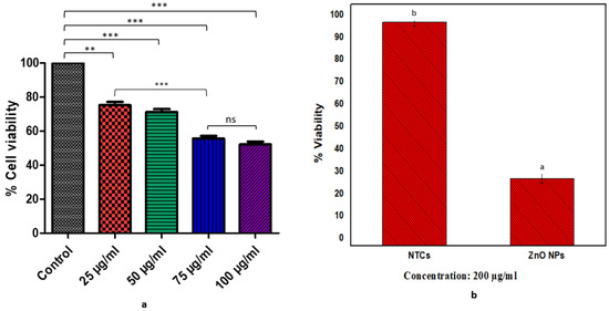 The anticancer potential of the prepared ZnO NPs was assessed against HepG2 liver-cancer cells. MTT (3-(4,5-dimethylthiazolyl-2)-2,5-diphenyltetrazolium bromide), referred to as a tetrazolium dye, was utilized to determine the in vitro-toxicity impact of extracts/NPs, as followed by [23]. In living cells, a reduction in MTT occurred in an insoluble formazan (purple product) that is measured spectrophotometrically. For 24 h, pre-seeded HepG2 cells (>90% viability; 1 × 104 cells/well; 200 µL per well) in a 96-well plate were exposed with 200 µg/mL of the test samples. It was followed by the addition of 10 µL of MTT dye (5 mg/mL) per well, along with 3 h of incubation. Then, insoluble formazan was dissolved by the addition of 10% acidified sodium dodecyl sulfate (SDS), and incubation of the cells was completed overnight. By utilizing a microplate reader (Thermo Scientific Multiskan GO), analysis of each plate was completed at 570 nm. Untreated HepG2 cells (NTC) acted as a control. Prior to cytotoxicity screening, centrifugation of the extract was performed, and the sonication of NPs was completed by ultrasonic bath (USC1200TH, Prolabo, Sion, Switzerland). The percentage (%) of cell viability in contrast to the NTC sample was quantified, utilizing the following equation: