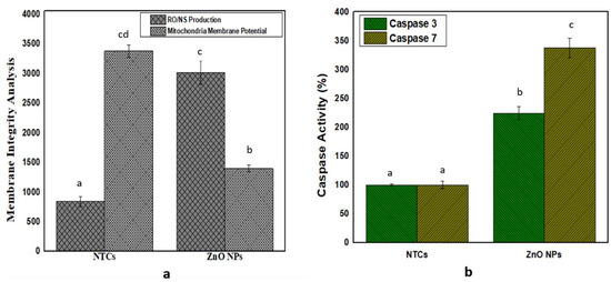 The mitochondria-membrane potential (ΔΨm) was determined by investigating the fluorescence of 3,3′-dihexyloxacarbocyanine iodide DiOC6, which is a specific probe, as followed by [41]. On the base of ΔΨm, DiOC6 stains the mitochondria. For this purpose, ZnO NPs were treated, while NTC HepG2 cells were grown in a culture medium containing 25 nM of DiOC6 and were incubated at 30 °C for 45 min. By utilizing a Versa Fluor Fluorimeter, the fluorescence signal was measured at 482 nm. For each condition, six independent measurements were conducted, and the results were represented as relative fluorescent units.
