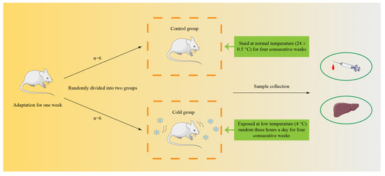 Mice were randomly divided into two groups: the room temperature (Control) group (n = 6) and the cold exposure (Cold) group (n = 6). The mice of the cold group were exposed to cold ambient temperature at 4 °C random 3 h a day for four consecutive weeks, while the control group was at 24 ± 0.5 °C. The specific experimental design is shown in Figure 1. After cold exposure, we collected blood and liver samples and put the blood sample in a refrigerator at 4 °C. The part of liver sample was frozen in liquid nitrogen and stored at −80 °C for subsequent examination, the rest of liver sample was fixed in 4% paraformaldehyde (Beyotime, Shanghai, China).
