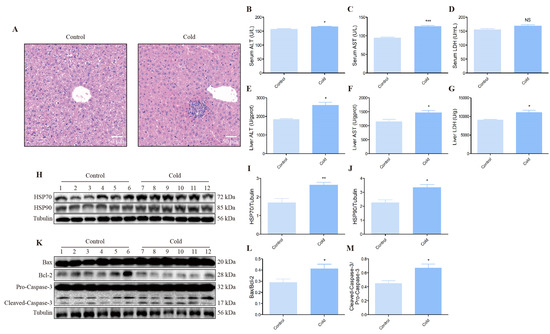 Effect of cold stress on the liver, activity of enzyme, level of stress and apoptosis-related protein. (A) The histopathological examination of liver of control and cold groups. (Scale bar = 50 µm). (B–D) The enzyme activity of ALT, AST and LDH in the serum of control and cold groups. (E–G) The enzyme activity of ALT, AST and LDH in the liver of control and cold groups. (H) HSP70, HSP90 and Tubulin protein levels in each group. (I,J) Quantification of expression levels based on expression ratios of HSP70/Tubulin and HSP90/Tubulin. (K) Bax, Bcl-2, Caspase-3 and Tubulin protein levels in each group. (L,M) Quantification of expression levels based on expression ratios of Bax/Bcl-2 and Cleaved-Caspase-3/Pro-Caspase-3. Data are presented as mean ± standard (n = 6). NS means not significant, * p < 0.05, ** p < 0.01, *** p < 0.001.