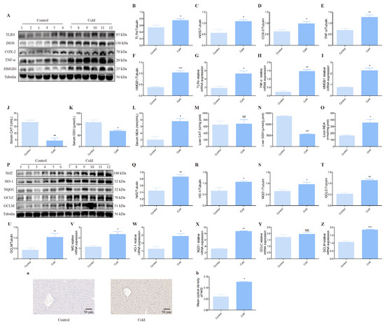Effect of cold stress on inflammatory cytokines expression, oxidative stress-related indexes and protein levels assessed by Western blot and ELISA. (A) TLR4, iNOS, COX-2, TNF-α, HMGB1 and Tubulin protein levels in each group. (B–F) Quantification of expression levels based on expression ratios of TLR4/Tubulin, iNOS/Tubulin, COX-2/Tubulin, TNF-α/Tubulin and HMGB1/Tubulin. (G–I) The histograms of relative mRNA analysis of TLR4/β-actin, TNF-α/β-actin and HMGB1/β-actin. (J–L) The enzyme activity of CAT, GSH and content of MDA in the serum of control and cold groups. (M–O) The enzyme activity of CAT, GSH and content of MDA in the liver of control and cold groups. (P) Nrf2, HO-1, NQO1, GCLC, GCLM and Tubulin proteins levels in each group. (Q–U) Quantification of expression levels based on expression ratios of Nrf2/Tubulin, HO-1/Tubulin, NQO1/Tubulin, GCLC/Tubulin and GCLM/Tubulin. (V–Z) The histograms of relative mRNA analysis of Nrf2/β-actin, HO-1/β-actin, NQO1/β-actin, GCLC/β-actin and GCLM/β-actin. (a) Immunohistochemical scans of Nrf2. (Scale bar = 50 µm). (b) Average optical density values of Nrf2 proteins. Data are presented as mean ± standard (n = 6). NS means not significant, * p < 0.05, ** p < 0.01, *** p < 0.001.