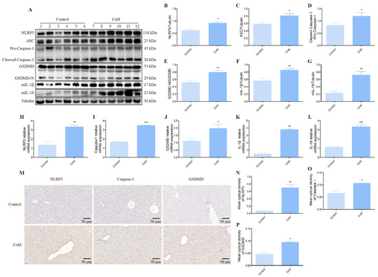 As shown in Figure 4, cold stress resulted in a significant increase in the NLRP3/GSDMD pyroptosis pathway. The Western blot result shows that NLRP3, ASC, Caspase-1, GSDMD, IL-1β, IL-18 protein levels were up-regulated in the cold groups relative control groups (Figure 4A–G). In addition, mRNA expression data demonstrated that NLRP3, Caspase-1, GSDMD, IL-1β and IL-18 gene expression were activated after cold exposure compared with control groups (Figure 4H–L). Furthermore, immunohistochemistry results further revealed more content of NLRP3, Caspase-1, GSDMD in the liver (Figure 4M–P).