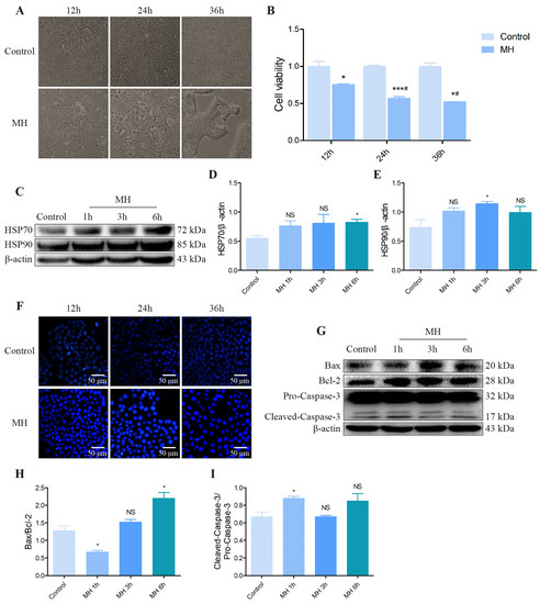 Effect of MH treatment on the cell morphology, number, HSPs and apoptosis-related protein expression in the AML12 cells. (A) The morphology of AML12 cells of control and cold groups. were observed under a microscope. (Scale bar = 50 µm). (B) MTT assay was used to detect the effect of MH on the growth and proliferation of AML12 cells. (C) The protein level of HSP70, HSP90 and β-actin in each group. (D,E) Quantification of expression levels based on expression ratios of HSP70/β-actin and HSP90/β-actin. (F) Hoechst 33258 staining was used to detect the effect of MH on AML12 cell apoptosis. (Scale bar = 50 µm). (G) The protein level of Bax, Bcl-2, Caspase-3 and β-actin in each group. (H,I) Quantification of expression levels based on expression ratios of Bax/Bcl-2, Cleaved-Caspase-3/Pro-Caspase-3. Data are presented as mean ± standard (n = 3). NS means not significant, * p < 0.05, *** p < 0.001, # p < 0.05. Where * represents comparison with the control group corresponding to their respective time, and # represents comparison with MH 12 h.
