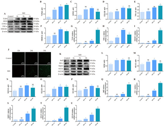 Effect of MH treatment on the expression of inflammatory cytokines and oxidative stress-related indexes in the AML12 cells. (A) TLR4, iNOS, COX-2, TNF-α, HMGB1 and β-actin protein levels in each group. (B–F) Quantification of expression levels based on expression ratios of TLR4/β-actin, iNOS/β-actin, COX-2/β-actin, TNF-α/β-actin and HMGB1/β-actin. (G–I) The histograms of relative mRNA analysis of TLR4/β-actin, TNF-α/β-actin and HMGB1/β-actin. (J) ROS probe fluorescence staining was used to detect the effect of MH on oxidative stress in AML12 cells. (Scale bar = 50 µm). (K) Nrf2, HO-1, NQO1, GCLC, GCLM and β-actin proteins levels in each group. (L–P) Quantification of expression levels based on expression ratios of Nrf2/β-actin, HO-1/β-actin, NQO1/β-actin, GCLC/β-actin and GCLM/β-actin. (Q–U) The histograms of relative mRNA analysis of Nrf2/β-actin, HO-1/β-actin, NQO1/β-actin, GCLC/β-actin and GCLM/β-actin. Data are presented as mean ± standard (n = 3). NS means not significant, * p < 0.05, ** p < 0.01, *** p < 0.001.