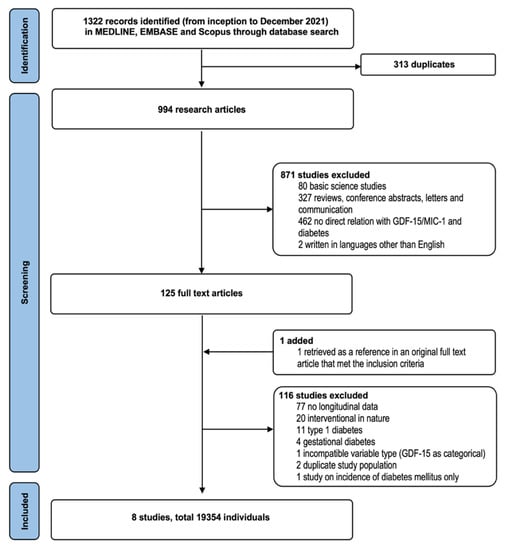 The following search terms were used: (GDF-15 OR MIC-1) AND (diabetes mellitus OR diabetes OR prediabetes OR hyperglycemia OR glucose OR insulin resistance). Two reviewers (S.X., Q.L.) independently evaluated the studies’ eligibility by screening literature titles and abstracts. Original research articles meeting the eligibility criteria were retrieved and reviewed. The inclusion criteria were: (i) type 2 diabetes; (ii) investigations into how circulating GDF-15 predicted risks of cardiovascular disease or mortality, (iii) human individuals, (iv) subjects aged 18 years or above, and (v) articles published in English. The exclusion criteria were: (i) basic science or animal research, (ii) subjects younger than 18 years old, (iii) type 1 diabetes, (iv) pregnant women, and (v) not primary and original research articles including reviews, commentaries, editorials, conference abstracts, or letters.