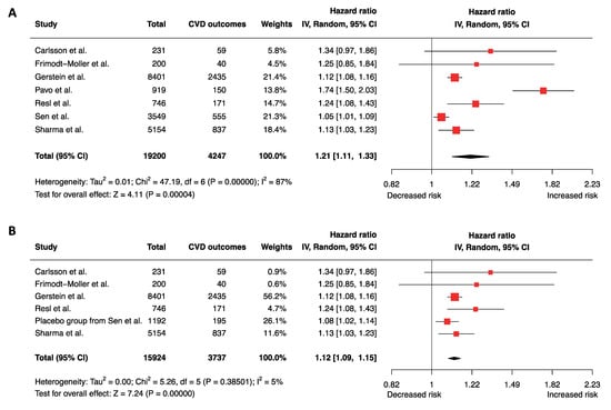 Elevated circulating GDF-15 levels are significantly associated with MACE. Pooled adjusted HRs are shown (A) with (HR 1.21, [1.11–1.33], I2 = 87%) and (B) without the unadjusted study by Pavo et al. and subjects who received canagliflozin (n = 2357 of 3549) in the study of Sen et al. (HR 1.12, [1.09–1.15], I2 = 5%).