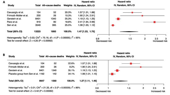 Pooled hazard estimates of all-cause mortality associated with increased circulating GDF-15 levels (A) including and (B) excluding the unadjusted study by Pavo et al. and canagliflozin received patients (2357 of 3549) from Sen et al. After removal of the unadjusted study, the I2 decreased 95% to 86%, the pooled effect size reduced from 1.47 to 1.27.