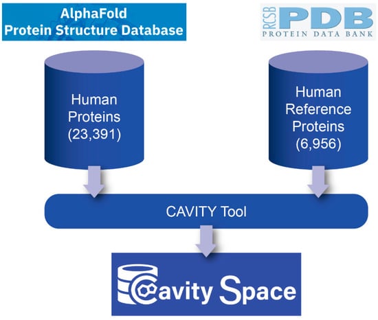 CavitySpace can be accessed at: http://www.pkumdl.cn:8000/cavityspace/ (accessed on 8 November 2021). AlphaFold protein structures are obtained from https://alphafold.ebi.ac.uk/ (accessed on 1 September 2021). UniProt information is available at https://www.uniprot.org/ (accessed on 1 October 2021). PDB structures and sequence alignment data were downloaded from https://www.rcsb.org/ (accessed on 8 November 2021). The CAVITY program is available at http://www.pkumdl.cn:8000/cavityplus/index.php (accessed on 1 September 2021).
