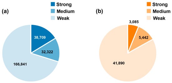 The cavity detection procedure found 237,872 cavities for the 18,672 AlphaFold structures. The druggability of each cavity was labelled as strong, medium or weak by CAVITY. Among the AlphaFold cavities, 16.3% (38,709) were predicted as strong druggable cavities (Figure 2). However, for AlphaFold cavities, we need to further consider the structure accuracy, because inaccurate structures may produce fake cavities. In AlphaFold structures, the predicted Local Distance Difference Test (pLDDT) was given for each residue to measure the local accuracy []. This confidence measure is a scale from 0 to 100. Structure regions with pLDDT > 90 are expected to be highly confident and can be used to characterize binding sites. Based on the pLDDT scores, we defined the ratio of the number of high confident residues (pLDDT > 90) to the total number of residues in the cavity as an Index to evaluate the reliability of the cavity structure. Among all the AlphaFold cavities, about 40% are located in protein structure regions with relatively high confidence (Index > 0.6), while only about 26% of strong cavities are constructed by reliable structures (Figure 3).