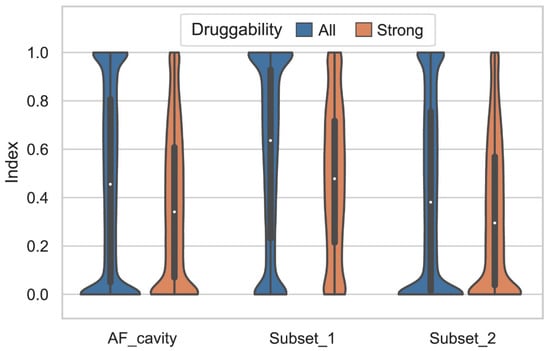 The distributions of Index that is the proportion of cavity residues with high confidence (pLDDT > 90). AF_cavity: cavities detected from AlphaFold predicted protein structures; Subset_1: cavities from proteins that have known 3D structures in our hrefPDB dataset; Subset_2: the remaining cavities after removing Subset_1 from AF_cavity. The distributions of all cavities (blue) and cavities with strong druggability (orange) in each dataset are displayed respectively.