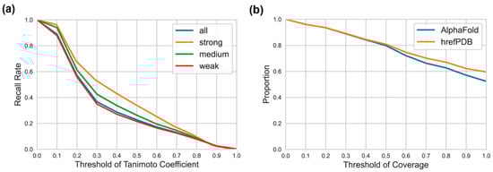 One important question is how different are the hrefPDB structures from the AlphaFold predicted structures for cavity detection. We further performed cavity detection for all the hrefPDB structures and obtained 50,417 PDB cavities. To make a fair comparison, we extracted the subset of AlphaFold structures sharing the same UniProt IDs to the hrefPDB structures and then collected 64,897 corresponding AlphaFold cavities. Theoretically, the cavities detected from hrefPDB structures should also be detected from AlphaFold predicted structures if the AlphaFold predicted structures are as reliable as the experimentally resolved structures. Therefore, we defined a score of Tc = A∩B/A∪B to measure the overlap of two cavities, where A and B are the residue sets of two cavities. We defined two cavities as the same pocket if their Tc score is larger than a given threshold. Figure 4a shows the recall rate of hrefPDB cavities in AlphaFold cavities at different thresholds. With a threshold of 0.5, only 22.8% of hrefPDB cavities can be detected from AlphaFold predicted structures, indicating non-negligible differences between the predicted structures and the real structures. This can be attributed to the following reasons. First, AlphaFold structures are always full-sequence structures, while part of the hrefPDB structures are not full-sequence structures and have missing residues, which affect the detection of cavities. Second, cavity detection results are influenced by protein conformation, which might be diverse under different ensemble states, binding states and experimental conditions. However, each AlphaFold structure from AlphaFold database gives only one single conformation, which may be different from the conformation of hrefPDB structures. For example, the AlphaFold structure of alpha-actinin-2 (UniProt ID: P35609) is different from its hrefPDB structure (PDB entry: 4D1E) [] (see Figure S1 and Supplementary Results for details). Third, the AlphaFold program can produce relatively accurate secondary structures, but the relative position of different secondary structures and different domains might not be very accurate, not to mention the inaccurate position of flexible loops. These inaccurate predictions can significantly influence the cavity detection process.