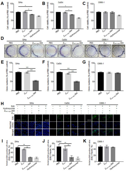 ZHPV16E7384 significantly inhibited the proliferation of the target cells (SiHa and Caski) (A–C) A cell viability assay was performed to evaluate the effect of ZHPV16E7384 on the target cells. Cells treated with ZWT or PBS were used as the negative controls while those treated with hydroxyurea were used as the positive controls. (D) A colony formation assay was performed to evaluate the suppression of cell proliferation by ZHPV16E7384. (E–G) The clone numbers in (D) were counted. (H) An EdU proliferation assay was performed to further evaluate the suppression of cell proliferation by ZHPV16E7384. Cell proliferation was determined by the incorporation of EdU (green). Cell nuclei were counterstained with Hoechst 33342 (Blue). Scale bar = 100 μm. (I–K) The ratio of EdU-incorporating live cells was calculated. The data shown are representative of three independent experiments. All experiments were performed in triplicate and data are expressed as the means ± SD (n = 3). * p < 0.05, ** p < 0.01, *** p < 0.001.