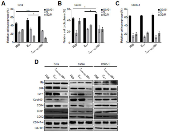 To explore the mechanism of ZHPV16E7384 inhibiting the target cell proliferation, we analyzed the effect of ZHPV16E7384 on the cell cycle by flow cytometry analysis. As shown in Figure 3A–C, compared to PBS and ZWT, ZHPV16E7384 treatment resulted in a significant G1/S cell cycle arrest in SiHa and CaSki cells, but not in the C666-1 cells.