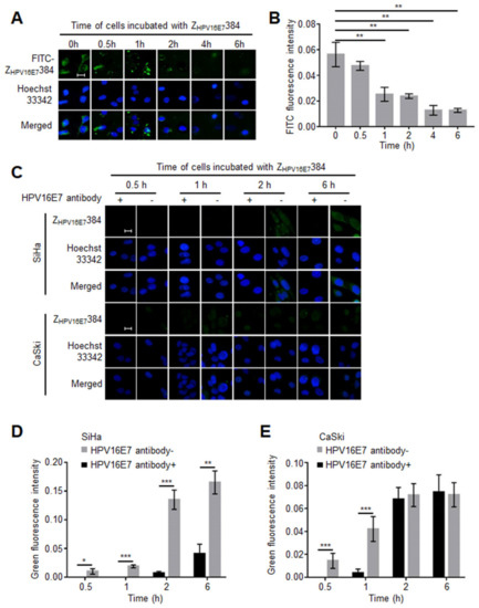 The SiHa cells were first incubated with 50 μm of free ZHPV16E7384 for 0, 0.5, 1, 2, 4, and 6 h, respectively. After being washed with PBS, the cells were then incubated with 50 μm of FITC-ZHPV16E7384 for 6 h. The SiHa cells incubated only with FITC-ZHPV16E7384 were used as a positive control while the SiHa cells incubated with the FITC-ZWT and C666-1 cells incubated with FITC-ZHPV16E7384 were used as the negative controls. After being washed with PBS and fixed with 4% paraformaldehyde for 15 min, the cells were stained with 6 μg/mL of Hoechst33342 (Invitrogen, CA, USA) for 10 min. The cells were analyzed by a confocal fluorescence microscope (TC-1, Nikon, Tokyo, Japan). The intensity of fluorescence was analyzed by using the method in previous studies [19,20].