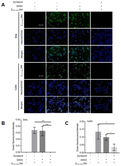 The ZHPV16E7384 internalization was dependent on Dynamin. (A) The SiHa and CaSki cells that were first treated with the dynamin inhibitor Dynasore in DMSO and then incubated with ZHPV16E7384 were analyzed by IFA (green). Cell nuclei were counterstained with Hoechst33342 (blue). Scale bar = 100 μm. (B,C) The intensity of the green fluorescence in (A) was analyzed. The data shown are representative of three independent experiments. All experiments were performed in triplicate and data are expressed as the means ± SD (n = 3). * p < 0.05, *** p < 0.001.
