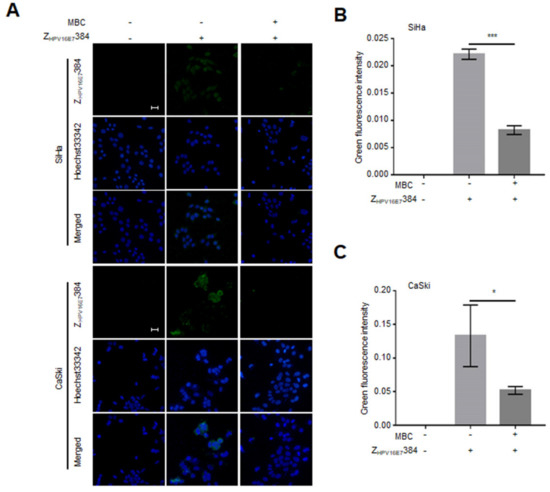 The ZHPV16E7384 internalization was dependent on caveolin-1. (A) The SiHa and CaSki cells that were first treated with the caveolin-1 mediated endocytosis inhibitor MBC and then incubated with ZHPV16E7384 were analyzed by IFA (green). Cell nuclei were stained with Hoechst33342 (blue). Scale bar = 20 μm. (B,C) The intensity of the green fluorescence in (A) was analyzed. The data shown are representative of three independent experiments. All experiments were performed in triplicate and data are expressed as means ± SD (n = 3). * p < 0.05, *** p < 0.001.