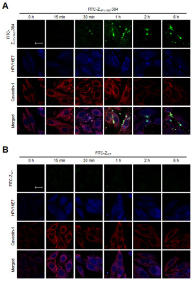 To further confirm the dependence of caveolin-1 during ZHPV16E7384 internalization, the co-localization of ZHPV16E7384, HPV16E7, and caveolin-1 was analyzed by confocal fluorescence microscopy. As shown in Figure 7, after the SiHa cells were incubated with FITC-ZHPV16E7384 for 30 min, the co-localization of ZHPV16E7384, HPV16E7, and caveolin-1 was observed. With the increase in the time that the cells were incubated with FITC-ZHPV16E7384, the co-localization became more and more obvious. However, the co-localization was not observed in the SiHa cells incubated with FITC-ZWT.
