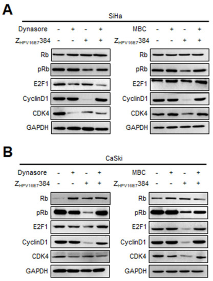 Dynasore and MBC reversed the effect of ZHPV16E7384 on cell cycle-related proteins. (A) The SiHa and (B) CaSki cells were respectively pre-treated with Dynasore and MBC and then incubated with ZHPV16E7384. The cell cycle-related proteins were then analyzed by Western blot. The SiHa and CaSki cells only treated with PBS, the inhibitors, or ZHPV16E7384 were used as the controls.