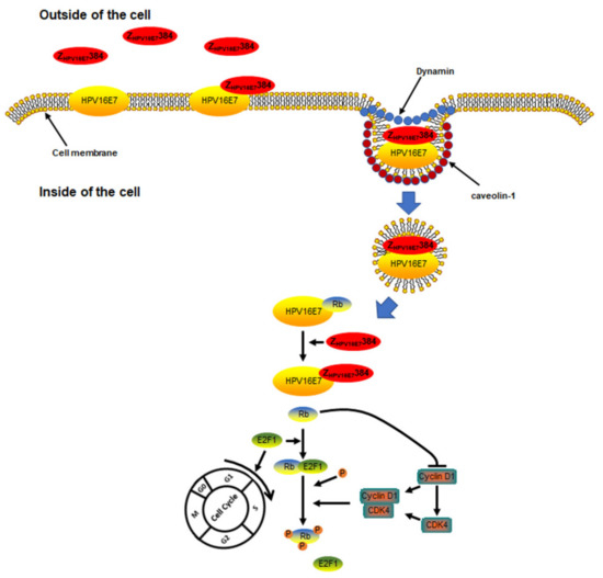 In conclusion, our results appear to show that ZHPV16E7384 specifically internalized into the target cells depending on the endocytosis, with two proteins (dynamin and caveolin-1) that mediated the endocytosis processes and that ZHPV16E7384 inhibited target cell proliferation by at least partially interrupting the E7/Rb/E2F1/cyclin D1/CDK4 pathway (Figure 9). Further studies need to be performed to confirm the conclusion. Possibly, the findings in this study provide a rationale of using ZHPV16E7384 to conduct a clinical trial for target therapy in cervical cancer.
