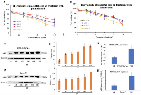 Effect of palmitic and linoleic acids on cytotoxicity, MRP1 protein levels, and ABCC1 gene expression in placental cell lines. Cell viability vs. concentration curves of HTR-8/SVneo, JEG-3, BeWo, and Swan-71 cells upon treatment with palmitic (A) and linoleic acid (B), determined by efflux assay. Effect of 0.5 mM palmitic acid on MRP1 protein expression in HTR8/SVneo (C) and Swan-71 cells (D) determined by Western blotting. Grayscale ratios were calculated with the help of ImageJ (E,F). ABCC1 mRNA expression upon treatment with 0.5 mM palmitic acid in HTR8/SVneo (G) and Swan-71 cells (H) determined by RT-qPCR. Mean values were obtained from three independent experiments and error bars indicate SD. SP, sodium palmitate. * p < 0.05 compared to controls.
