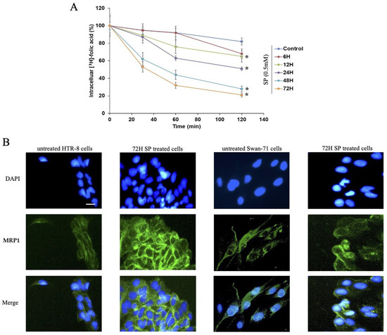 The HTR-8/SVneo cell line was provided by Dr. Charles Graham (Queens’s University, ON, Canada). Swan-71 cell lines were provided by Dr. Gil Mor (Yale University, CT, USA). JEG-3 and BeWo cell lines were obtained from ATCC (Manassas, VA, USA). DMEM, RPMI, and fatty acid-free bovine serum albumin (BSA) were purchased from VWR International Inc. (Bridgeport, NJ, USA). EMEM and F-12K media were obtained from ATCC. Palmitic and linoleic acids were obtained from TCI Chemicals (Portland, OR, USA). FBS was purchased from Atlanta Biologicals (Flowery Branch, GA, USA). Monoclonal antibodies against ABCB1, ABCG2, ABCC1, ABCC7, and GAPDH were obtained from Cell Signaling Technology (Danvers, MA, USA). N-acetylcysteine (NAC), trypsin, and Alexa Fluor 488 conjugated goat antirabbit IgG secondary antibody were obtained from Thermo Fisher Scientific Inc. (Rockford, IL, USA). The [3H]-folic acid, diammonium salt (50 µCi) was a product of Moravek Biochemicals, Inc (Brea, CA, USA). Corning transwell with permeable polycarbonate membrane inserts was purchased from Thermo Fisher Scientific Inc. The plasmid for ABCC1 for the CRISPR/Cas9 study was purchased from VectorBuilder (Chicago, IL, USA). Mouse embryonic fibroblasts, 2-mercaptoethanol and sodium pyruvate were obtained from Thermo Fisher Scientific Inc. Mitomycin C, heparin sodium salt, and M2 medium were purchased from Sigma Aldrich. Recombinant human FGF-4 was obtained from Peprotech (Cranbury, NJ, USA). EDTA, tetrasodium tetrahydrate salt, and Matrigel matrix were purchased from MilliporeSigma (Burlington, MA, USA). The plasmid for ABCC1 gene knockout was built and purchased from VectorBuilder. In addition, the plasmid extraction kit was purchased from Thermo Fisher Scientific Inc.