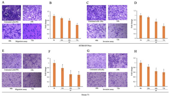 For the invasion assays, cells were treated with palmitic acid for 0 to 72 h and the cells that passed through the Matrigel and the transwell membrane were considered invaded cells. As shown in Figure 3C,D,G,H, as the time of exposure to palmitic acid increased, there was a decrease in the invasion of HTR-8/SVneo and Swan-71 cells. The invasion was the lowest in the cells treated with palmitic acid for 72 h, which was the longest exposure time.