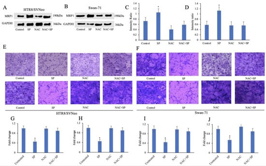 Effect of NAC on MRP1 expression and migration and invasion in palmitic acid-treated HTR-8/SVneo and Swan-71 cells. MRP1 expression in palmitic acid-treated HTR8/SVneo (A) and Swan-71cells (B) with or without NAC pretreatment determined by Western blotting. Grayscale ratios were calculated with the help of ImageJ (C,D). Migration (top row) and invasion (bottom row) of palmitic acid-treated HTR8/SVneo cells (E) and Swan-71 cells (F) with or without NAC pretreatment. Images were captured from the underside of the transwell inserts. Quantification (G–J) was carried out by counting the migrated or invaded cells using a hemocytometer. Mean values were obtained from three independent experiments and error bars represent SD. * p < 0.05 compared to controls.