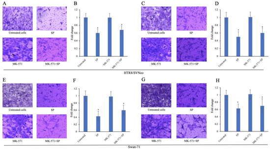 Effect of MK-571 on migration and invasion in palmitic acid-treated HTR-8/SVneo and Swan-71 cells. Migration (A) and invasion (C) in HTR-8/SVneo cells with or without palmitic acid exposure and MK-571 pretreatment and migration (E) and invasion (G) of Swan-71 cells after the same exposures. Images were captured from the underside of the transwell inserts. Quantification (B,D,F,H) was carried out by counting the migrated or invaded cells using a hemocytometer. Mean values were obtained from three independent experiments and error bars represent SD. * p < 0.05 compared to controls.