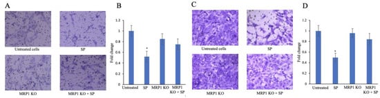 Effect of ABCC1 knockout on migration and invasion in Swan-71 cells exposed to palmitic acid. Migration (A) and invasion (C) in Swan-71 ABCC1 knockout and wild-type cells with or without exposure to palmitic acid. Images were captured from the underside of the transwell inserts. Quantification (B,D) was carried out by counting the migrated or invaded cells using a hemocytometer. Mean values were obtained from three independent experiments and error bars represent SD. * p < 0.05.