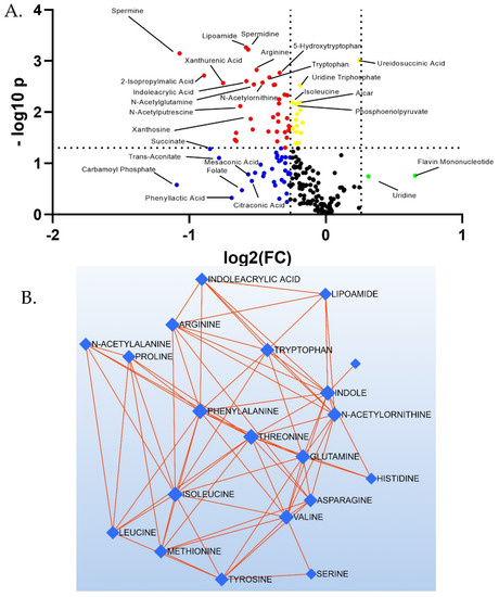 Targeted metabolomics reveals a greater number of down-regulated species. (A) Volcano plot of all 207 features: red dots—both p < 0.05 and log2(FC) < −0.26; yellow dots- p < 0.05 and log2(FC) > −0.26 and <+0.26; blue dots- p > 0.05 and log2(FC) < −0.26; black dots- p > 0.05 and log2(FC) > −0.26 and <+0.26; green dots- p > 0.05 and log2(FC) > +0.26. (B) Amino acid network showing the most highly regulated subnetwork. Red edges show positive correlations. The thicker the edge, the stronger the correlation.