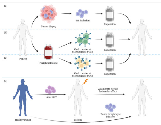 T cells have an impressive ability to detect and eliminate tumors in an antigen-specific manner. The latter feature is also one of the main reasons why T cells have come into focus for (targeted) immune cell-based therapies in cancer. Here, the adoptive transfer of autologous or allogeneic T cells, which recognize and attack cancer cells, has been an especially effective concept for several malignancies [1]. Current adoptive T cell-based therapies include ex vivo-expanded autologous tumor-infiltrating T cells (TILs), donor lymphocyte infusions (DLIs) after allogeneic hematopoietic stem cell transplantation (alloHSCT), and genetically modified T-lymphocytes carrying chimeric antigen receptors (CARs) or transgenic T cell receptors (TCRs) (Figure 1). Despite all of these amazing advances, T cell-based therapies fail in a substantial proportion of patients. This may be due to loss of the target antigen or other inhibitory factors present within the tumor environment (TME) [2]. These inhibitory mechanisms include direct immunosuppression by immune checkpoints and a T cell-inhospitable TME, leading, among other things, to reduced persistence and a loss of effector functions [3].