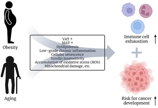 Role of obesity and aging in oncogenesis. Obesity and aging share characteristics. In both conditions, an increase in visceral and bone marrow adipose tissue is observed [37,38,40]. In addition, dyslipidemia [39], low-grade chronic inflammation leading to cellular senescence [31,46], as well as increasing insulin insensitivity [46], accumulation of ROS [46], mitochondrial damage [46] etc., are considered mutual concomitants of obesity and aging. These factors may eventually lead to immune cell exhaustion/dysfunction and an increased risk of developing cancer over time.