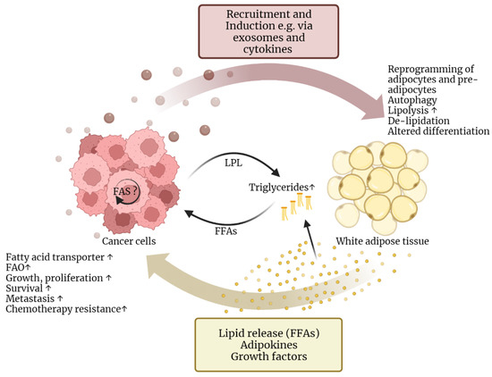 Reciprocal reprogramming of cancer cells and adipocytes. Adipocytes are part of the tumor microenvironment in multiple cancer entities. They can be induced and activated by tumor-derived factors, such as exosomes and cytokines. This results in the reprogramming of adipocytes and adipose stem cells, which includes autophagy, lipolysis, delipidation due to the release of free fatty acids (FFAs), de-differentiation of mature adipocytes and altered differentiation of adipose stem cells into senescent cancer-associated adipocytes. In addition to FFAs, adipocytes also secrete tumor-promoting adipokines and growth factors. FFAs can be directly taken up by the tumor cells or increase triglycerides (TGs) in the blood. These TGs can be hydrolyzed by tumor-derived LPL to FFAs, which then are taken up by tumor cells. In turn, uptake of FFAs from the microenvironment increases the expression of fatty acid transporters and FAO, stimulates growth and proliferation, increases survival, the ability for metastasis and resistance to chemotherapy. Cancer cells can also upregulate intrinsic fatty acid synthesis (FAS). However, newly synthesized FAs are not secreted and are rather used as substrates in anabolic processes and signaling.