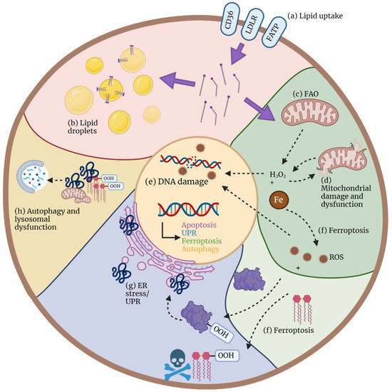 Mechanisms of lipotoxicity. Excessive lipids, especially free fatty acids (FFAs), are frequently present in the TME. (a) FFAs can be taken up into the cell via specific transporters, such as CD36, LDL receptor (LDLR) and fatty acid transporter proteins (FATPs). Once in the cytoplasm, FFAs have different fates and might cause lipotoxicity via different mechanisms, which are often interconnected. (b) To prevent lipotoxicity, FFA can be stored in lipid droplets as triglycerides (TGs) for later use or simply as a protective mechanism (pink). Excess FFAs in the cytoplasm trigger the following effects: (c) FFAs can be transported into the mitochondria to fuel FAO and, subsequently, oxidative phosphorylation (OXPHOS). One of the products of these reactions is hydrogen peroxide (H2O2), one of the most abundant reactive oxygen species (ROS) that can lead to oxidative stress, mitochondrial (d) and DNA damage (e), and, subsequently, cell death. (f) Excessive ROS in the presence of iron (Fe) can lead to lipid and protein peroxidation and, subsequently, a recently described type of regulated cell death termed ferroptosis. (g) Protein peroxidation, among other processes, leads to the accumulation of misfolded proteins in the endoplasmic reticulum (ER), which causes ER stress and triggers the unfolded protein response (UPR). (h) Misfolded proteins, oxidized lipids, and malfunctional organelles are eliminated in the lysosomes via the process of autophagy, whose overload results in lysosomal dysfunction.