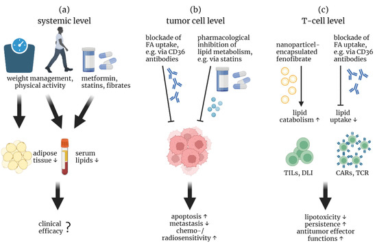 Therapeutic approaches to circumvent lipotoxic barriers. Overcoming T cell-related lipotoxicity in cancer for adoptive therapy could be achieved at three levels: (a) on a systemic level, (b) on a tumor cell level and (c) on a T cell level. (a) To decrease tumor-supporting adipose tissue and consequently lower serum lipids in overweight and obese patients, weight management and physical activity could be beneficial. In addition, metformin, statins and fibrates could be used to reduce serum lipids. However, the clinical efficacy and reliability still have to be demonstrated. (b) Blockade of lipid uptake, e.g., by an anti-CD36 antibody, and pharmacological inhibition of lipid metabolism, e.g., by statins, restrict the lipid pool in tumor cells from which the cells could generate energy and molecules for biosynthesis. As a result, tumor cells undergo apoptosis, exhibit reduced metastasis and invasiveness, and become more sensitive to chemotherapy and radiotherapy. (c) Enhancing lipid catabolism, e.g., by fenofibrate in CD3-targeted nanoparticles, and blocking the uptake of excess lipids could prevent lipotoxicity in TILs and transferred T cells in a lipid-enriched TME, resulting in T cell persistence and sustained anti-tumor effector function.