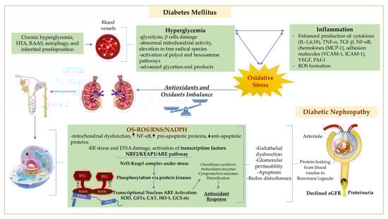 Intricate pathophysiological changes precede the detection of DKD [20]. An extensive gene map realized by studying the genome of 157 patients of European descent who have CKD of different etiologies, including DKD, revealed that the key pathophysiology pathways are the ones that modulate both the metabolism and inflammation, with NRF2 being at the core of both [21,22]. Further, OS is considered to be a major feature of CKD and it is of significant importance as it has many cross-links with other pathophysiological elements [22]. Furthermore, the renin–angiotensin system, tubuloglomerular feedback, hyperglycemia, hypertension, autophagy and inherited predisposition have all been incriminated to play a role in diabetes-related kidney damage [13,23,24,25].