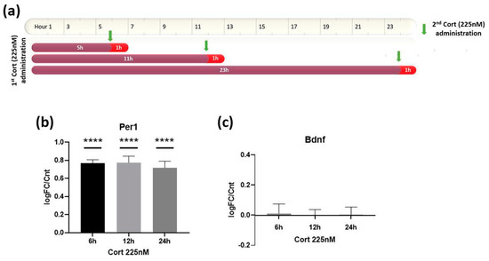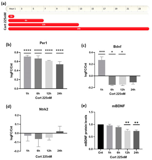 Initially, we wanted to establish the 24-hour-long baseline pattern of Bdnf expression profile on our astrocytes after the administration of Corticosterone (Cort) at concentration levels that would imitate the secretion of a physiological GC pulse in murine. Taking into account measurements of the circulating corticosterone levels in the serum and plasma of unstressed mice [25,26], we determined that the preferable concentration is at 225 nM. In order to ensure that we would be able to detect both early and late effects of the Cort administration, we established four timepoints (1 h, 6 h, 12 h and 24 h) to measure Bdnf expression levels with qRT-PCR and compared them to the respective expression levels of cultures treated with the appropriate concentration of vehicle (Figure 1a).